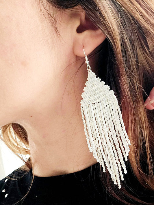 Cercei lungi franjuri argintiu-alb