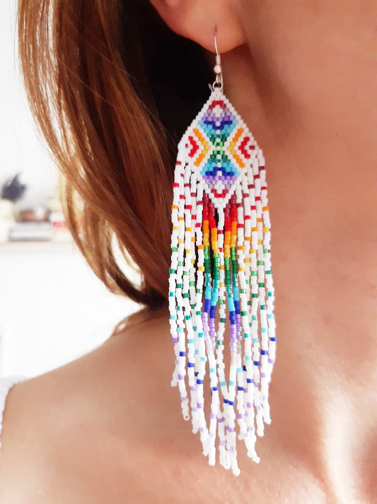 Cercei lungi franjuri cu cerc alb-auriu-maro-rosu