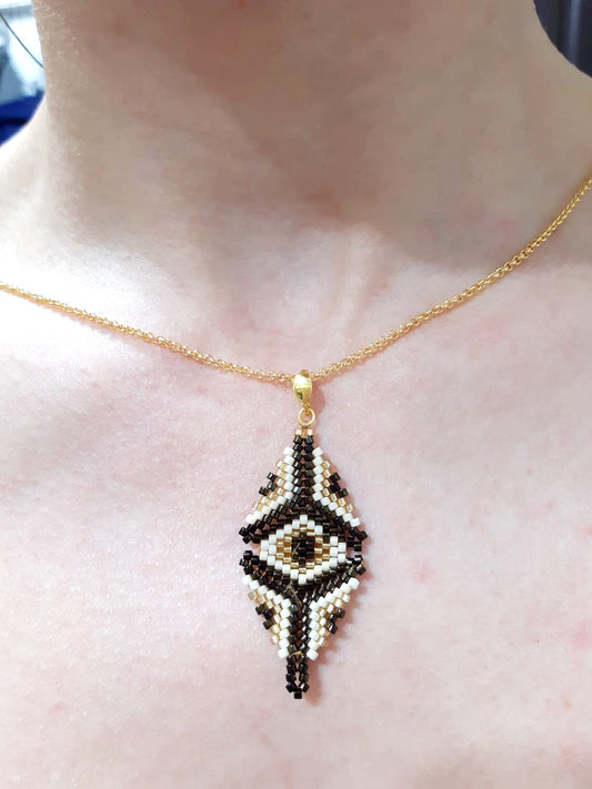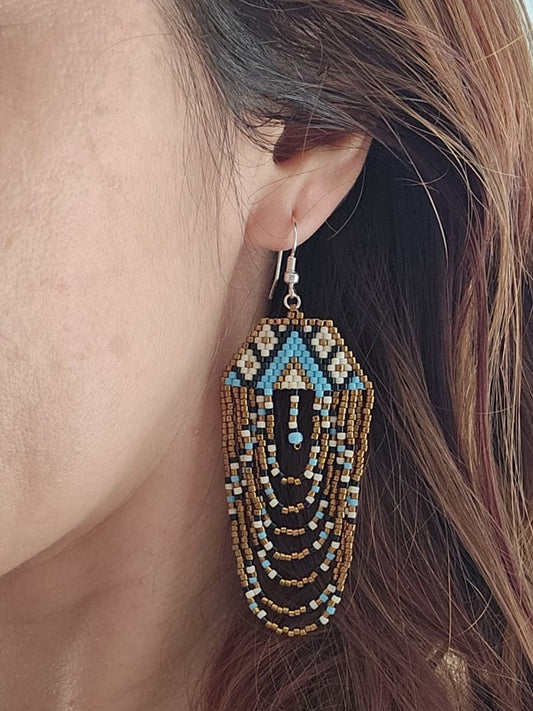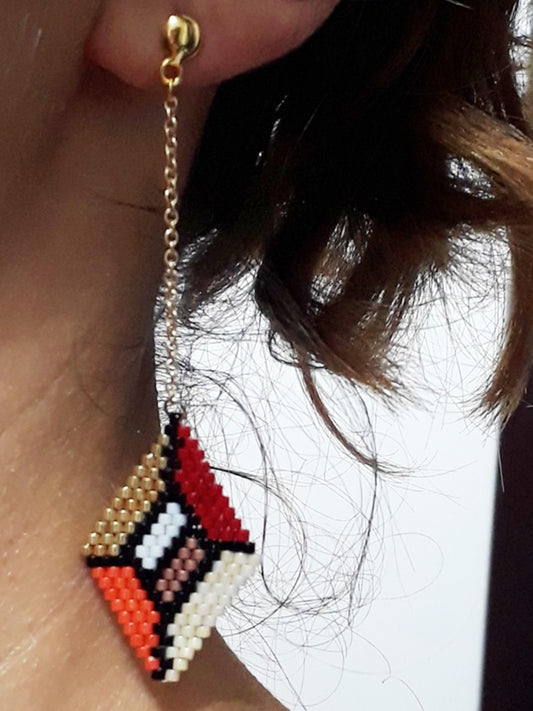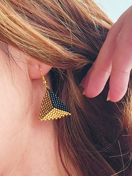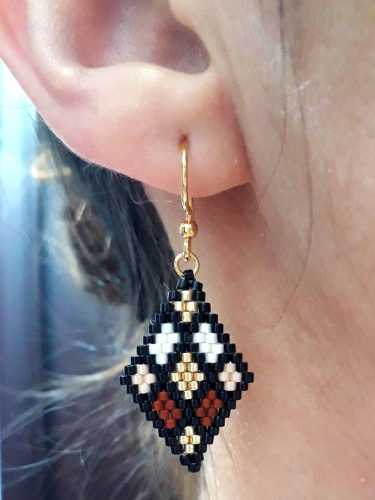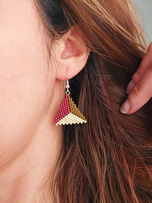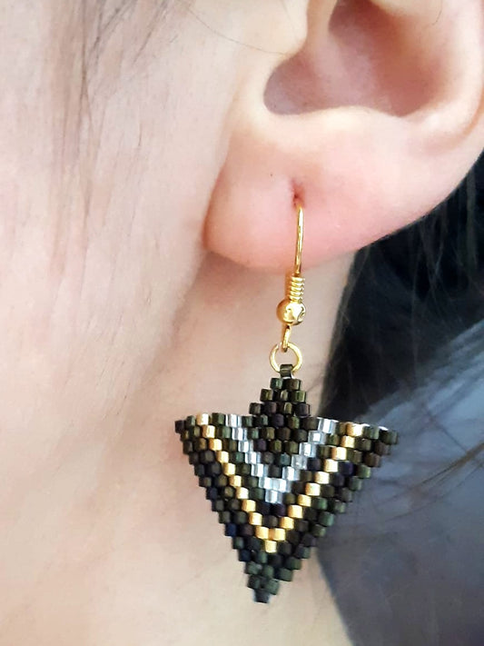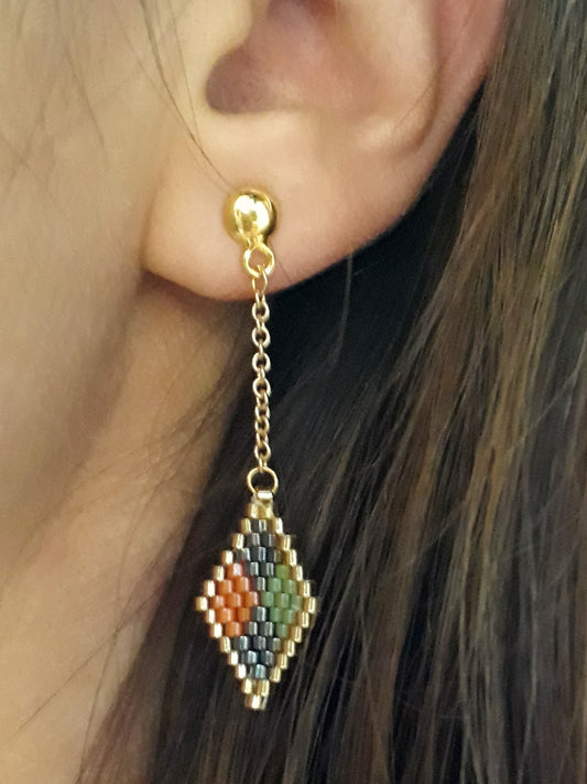 Set cercei triunghi si pandantiv romb maro-auriu-alb